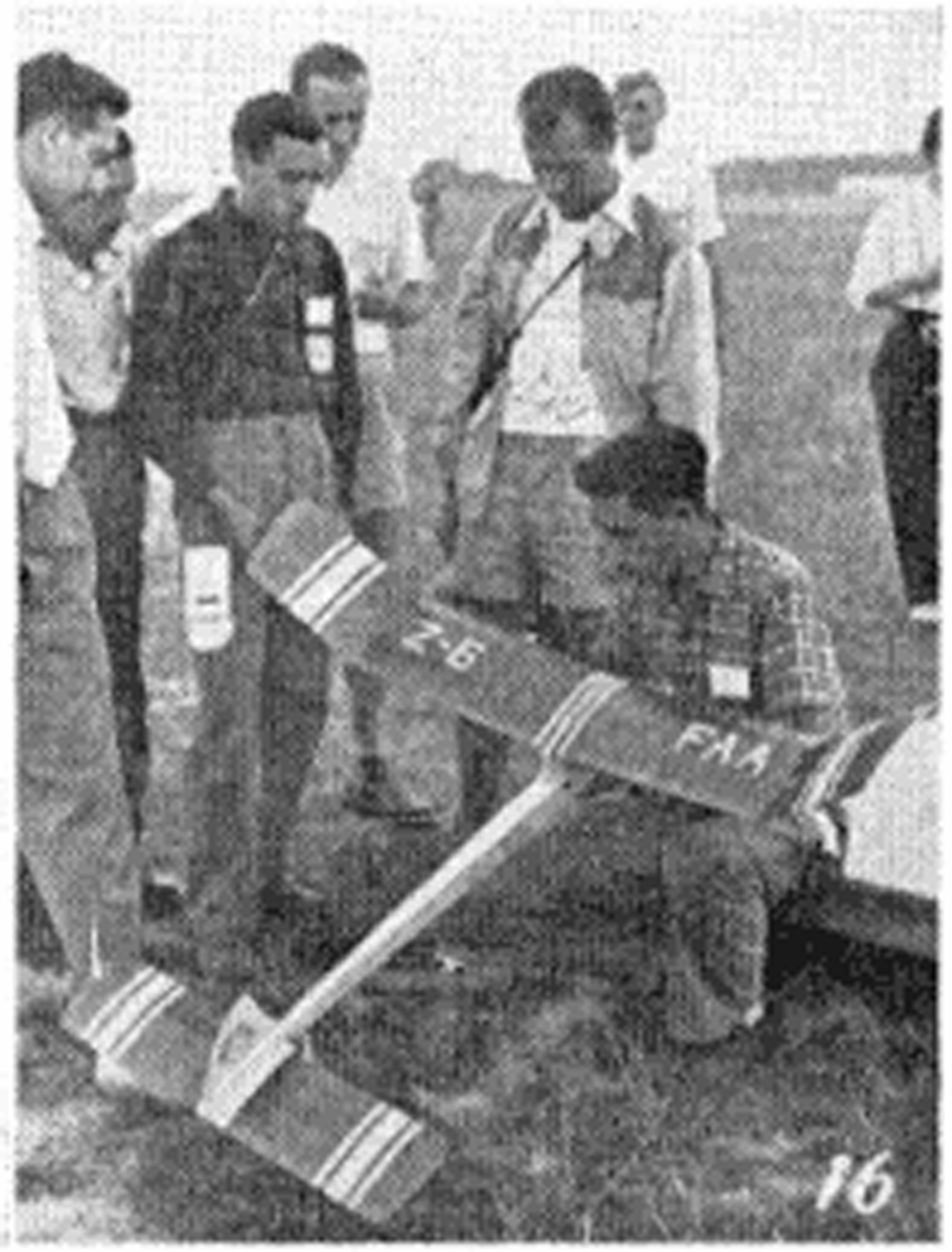 It seemed as though the motor would never cut; but finally the ship began a tell-tale lazy circle to the left. Far above the other ships it seemed to hang in mid‑air while a slight wind carried it down the field. Apparently it was headed for the "last resting place of lost models," so we piled into the car and began the chase. After a wild 10‑mile ride the ship was recovered and upon returning to the field we learned it had been in sight 32 minutes Many other flights like this have been made since.