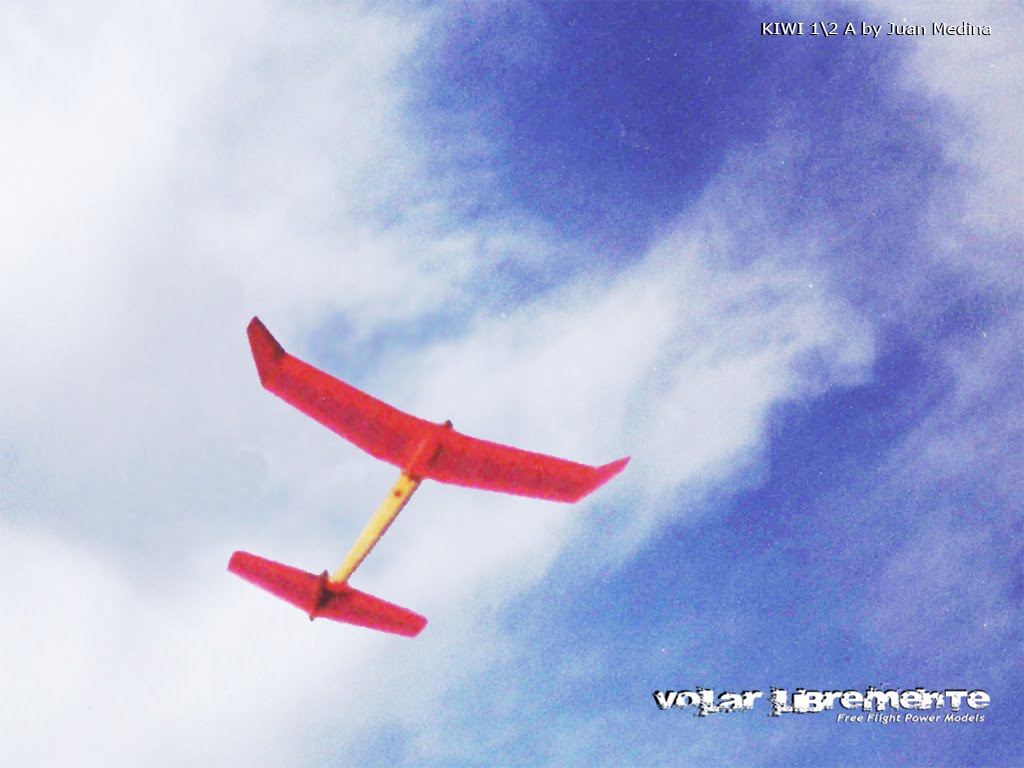 El modelo de Kiwi 1/2 que vuelo actualmente es una ampliación de este que había sido construido con las dimensiones originales de 890 mm. de envergadura, a partir del plano de Guillow. Mi actual Kiwi 1\2 A ampliado a 15 dmts. 2 de sup. alar está motorizado con un COX Medallion .049 con cilindro de cuatro ranuras de escape y aguja de Doug Galbreth. Verdaderamente el modelo se comporta durante la trepada y luego en el planeo de una forma espectacular.